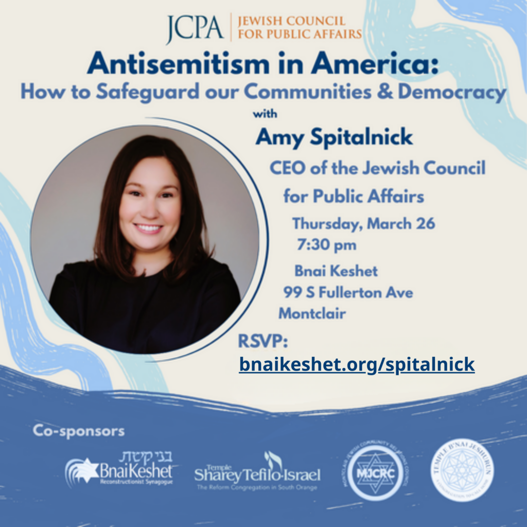 This event is co-sponsored by Bnai Keshet, Temple Sharey Tefilo-Israel, Temple B'nai Jeshurun, and the Montclair Jewish Community Relations Council.