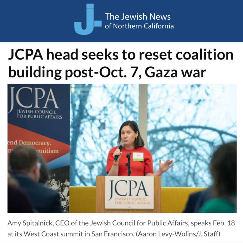 Just before our first-ever West Coast Summit, our CEO Amy Spitalnick spoke with J. The Jewish News of Northern California about the hard work of coalition-building, how Jewish safety is inseparable from our democracy, & why we need to be engaged all over the country.