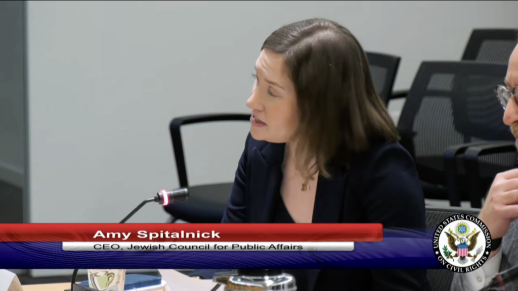 WASHINGTON – Breaking the cycle of antisemitism requires approaches by government and civil society that “recognize Jewish safety is inextricably linked with the rights and safety of all communities and our democracy,” Amy Spitalnick, CEO of the Jewish Council for Public Affairs and a leading expert on combating hate and extremism, said at a public briefing held today by the U.S. Commission on Civil Rights. Her full remarks, as prepared for delivery, can be read here.